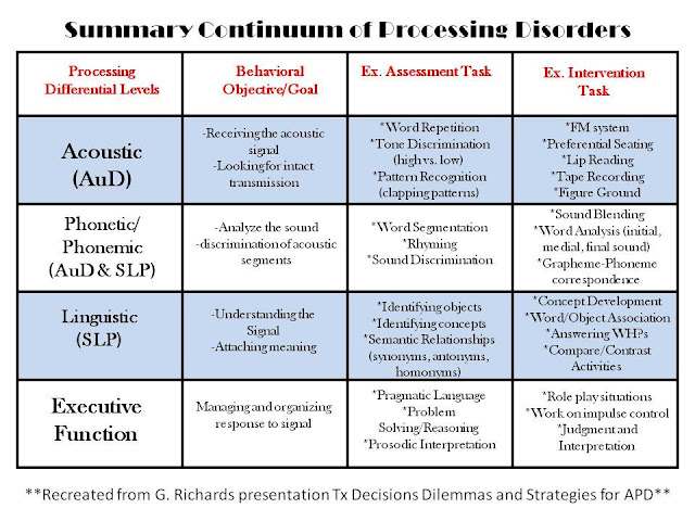 -If the area of need is in the “transition area”: SLPs will dx the student with “deficits in phonology or phonological awareness, while the AuD will dx the student with APD. And treatment would focus on phonological awareness skills (sound discrimination, blending, segmenting, rhyming, etc.).