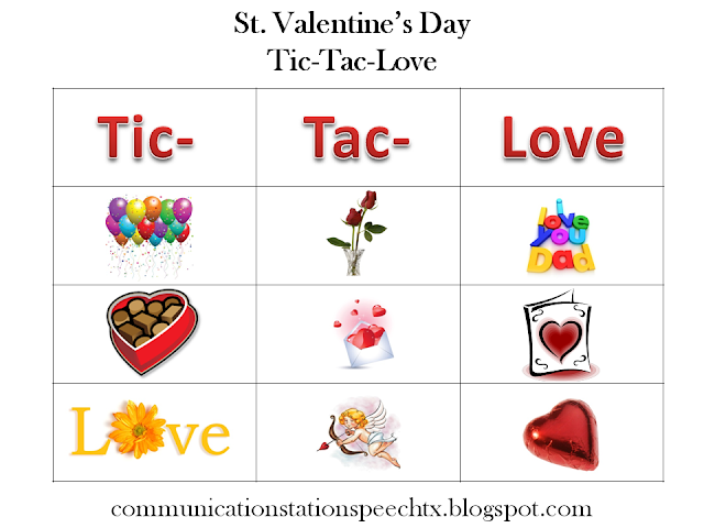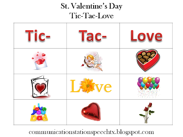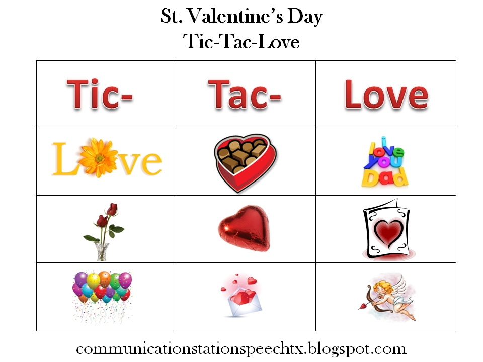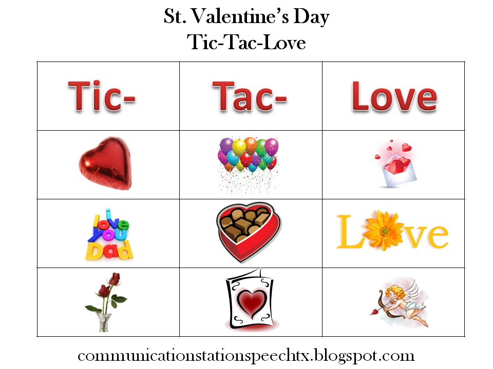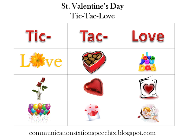 Parents wanting to use this game: practice your child’s speech and language homework/pictures, etc. and after a few trials, have you and your child choose a card and place a chip or candy heart on the picture chosen.  OR just play like regular tic-tac-toe. Whomever gets 3 in a row in wins!!!