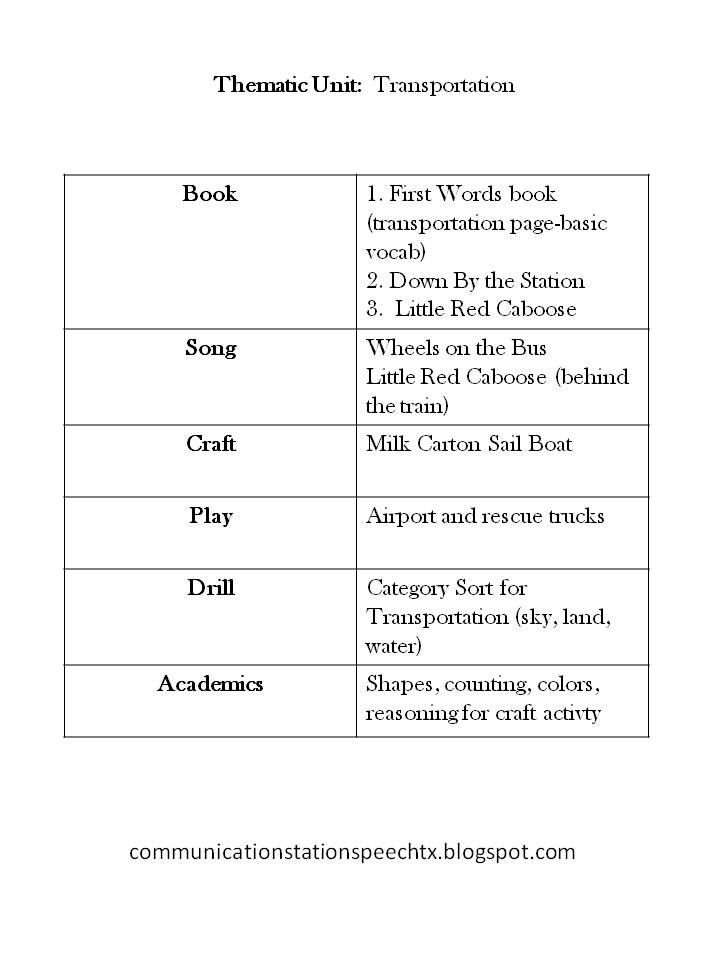 When I first started using thematic units as a therapy guide I created my own table like the one below to keep me on track and organized. Over time, I used the table less and less but in my mind I still organized my thematic therapy the same way. So here is just a visual example for you: